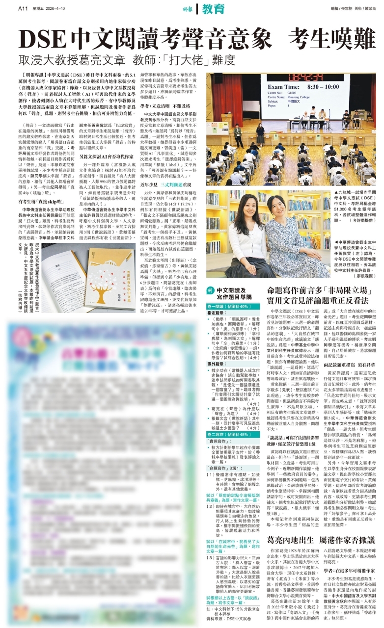 DSE中文閱讀考聲音意象 考生嘆難 (Ming Pao, 10 April 2026)